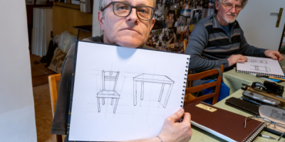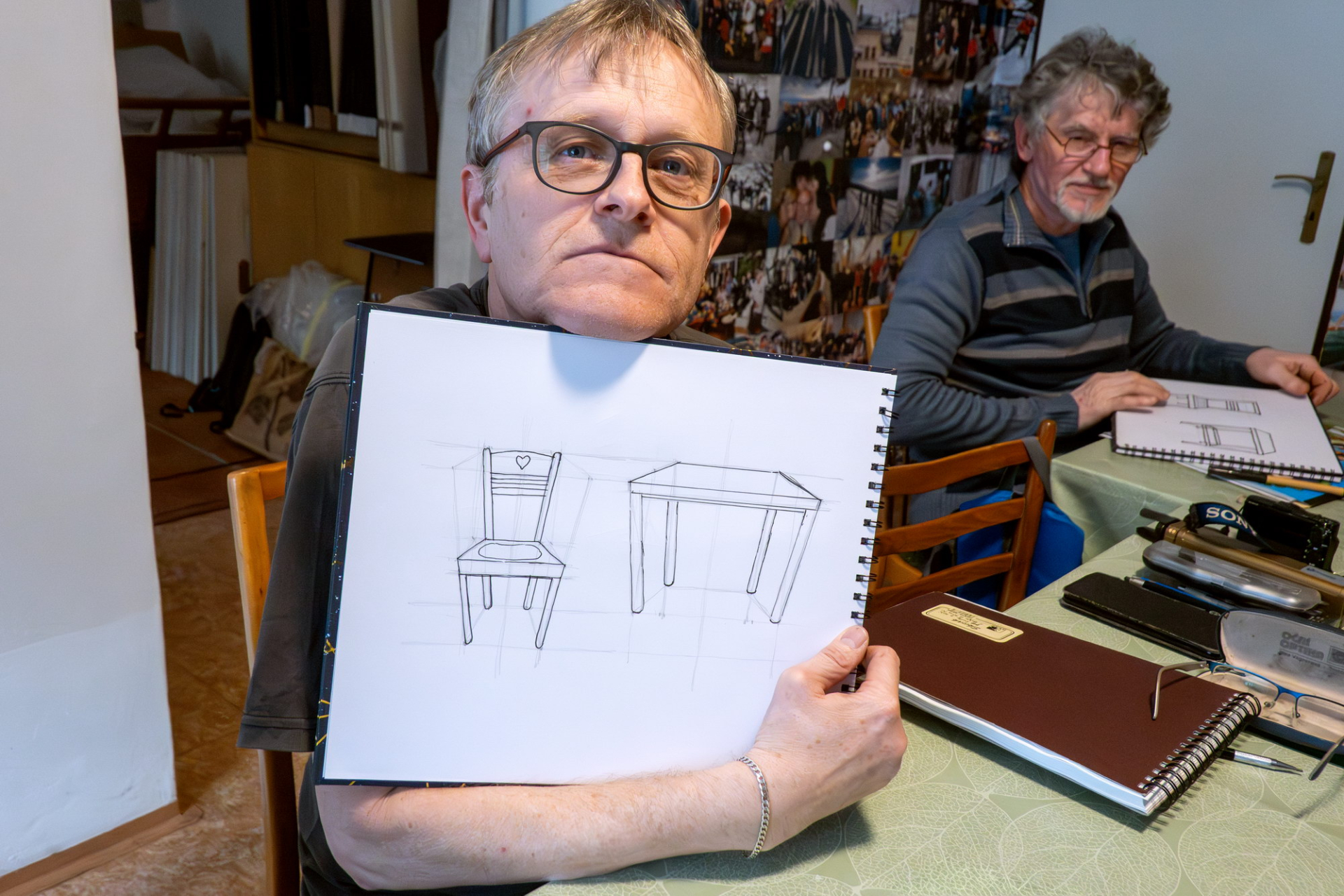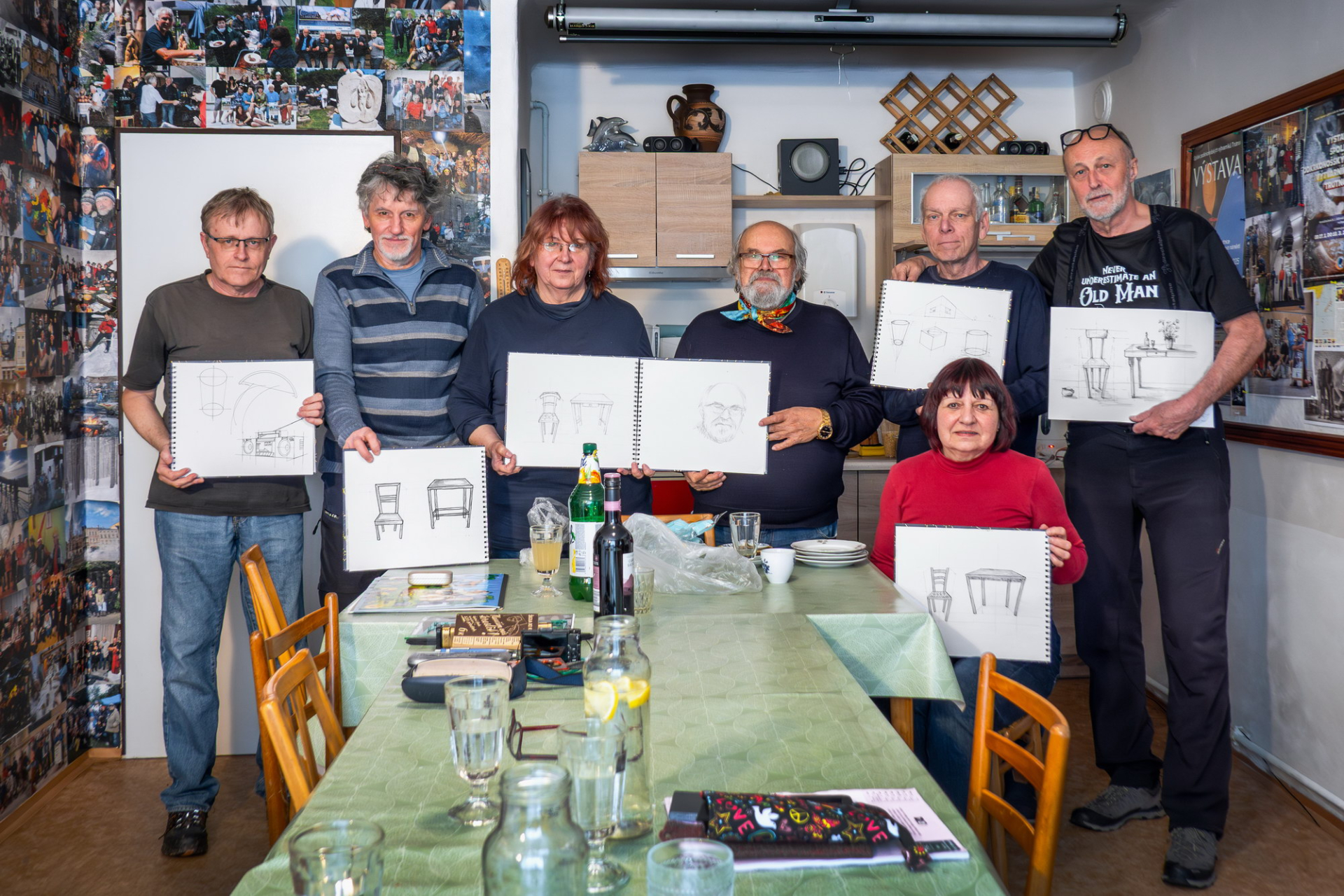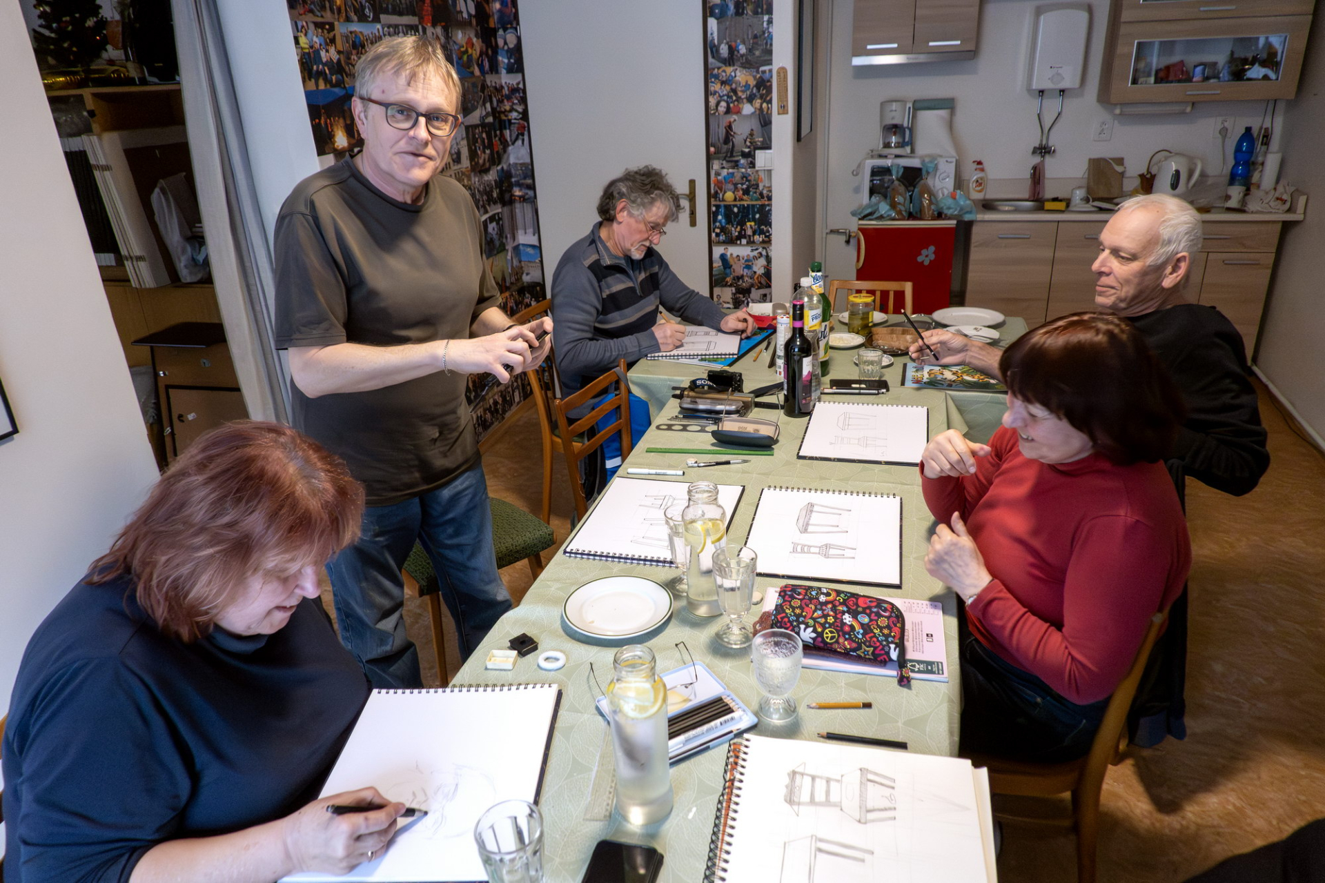 Po teoretickém úvodu a demonstraci různých technických možností na plátně jsme se pustili do vlastního kreslení. Nadhled, podhled, středová osa, horizont..., kreslili jsme od oka, nešlo o rýsování, ale o tvořivou činnost. Krychle, válec, židle a stůl, někdo pochodil lépe, jiný hůř, ale pobavili jsme se všichni.