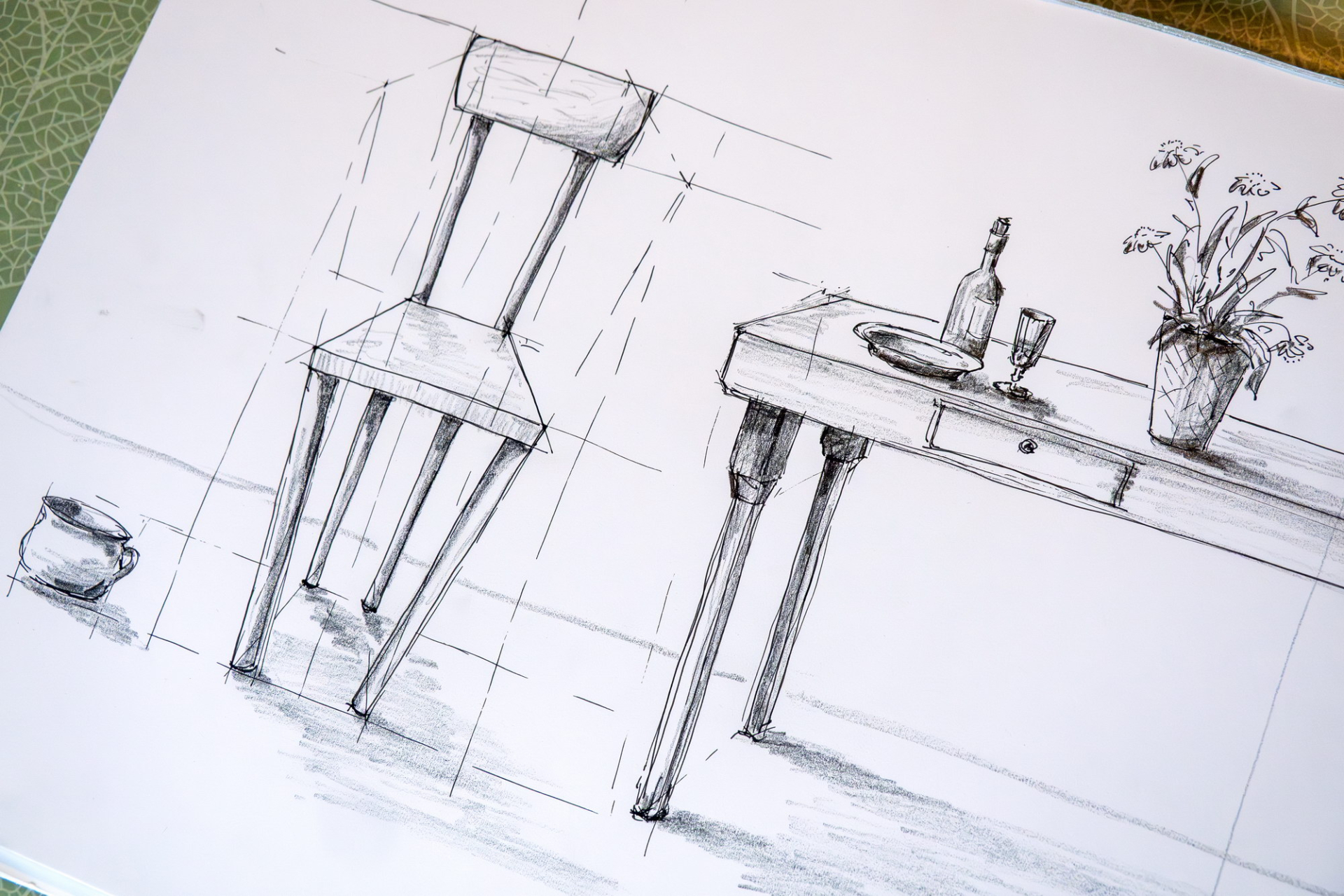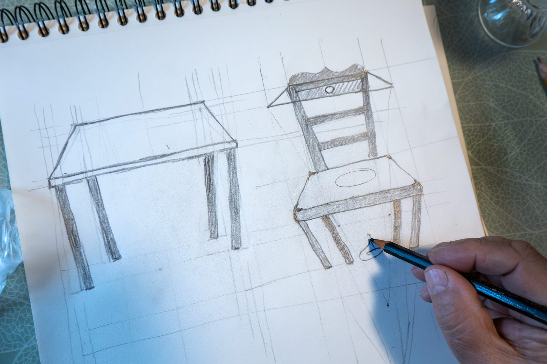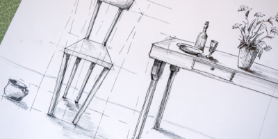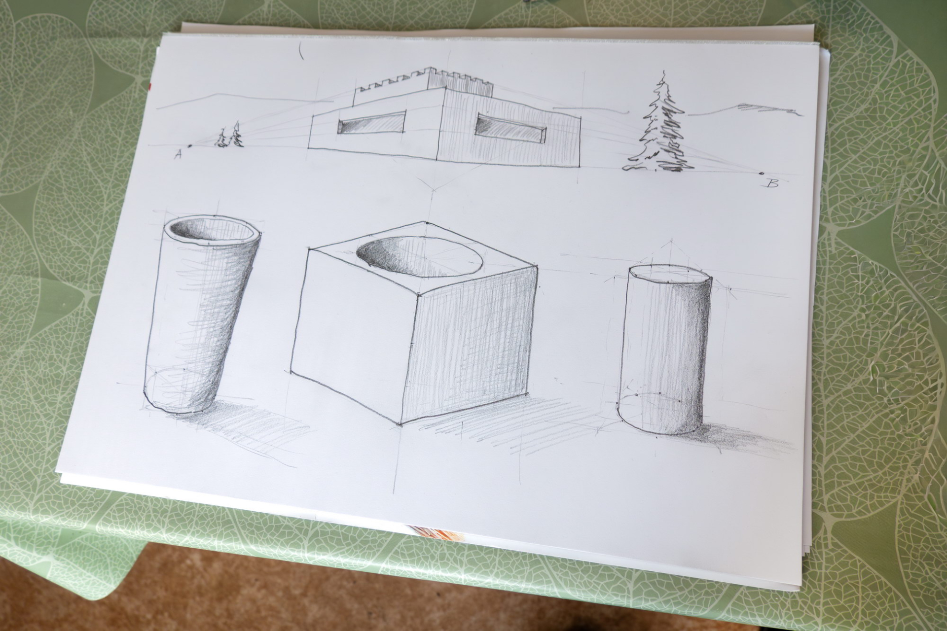 Po teoretickém úvodu a demonstraci různých technických možností na plátně jsme se pustili do vlastního kreslení. Nadhled, podhled, středová osa, horizont..., kreslili jsme od oka, nešlo o rýsování, ale o tvořivou činnost. Krychle, válec, židle a stůl, někdo pochodil lépe, jiný hůř, ale pobavili jsme se všichni.
